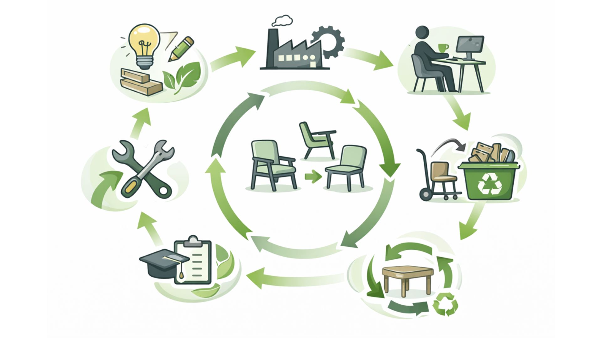 The CirCLER training toolkit supports the entire learning pathway of future Circular Economy Transition Managers (CETMs), starting from the fundamental principles introduced in the first module (M1) and moving towards strategic reflection and future perspectives developed in the final module (M10). As the opening and closing modules of the training programme, M1 and M10 help structure a comprehensive pathway that supports learners in understanding the challenges of circularity and in translating knowledge into concrete actions within the furniture sector.