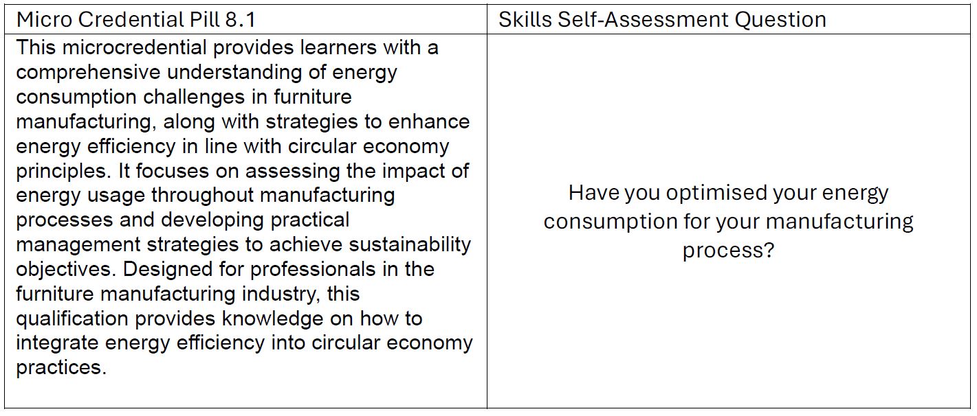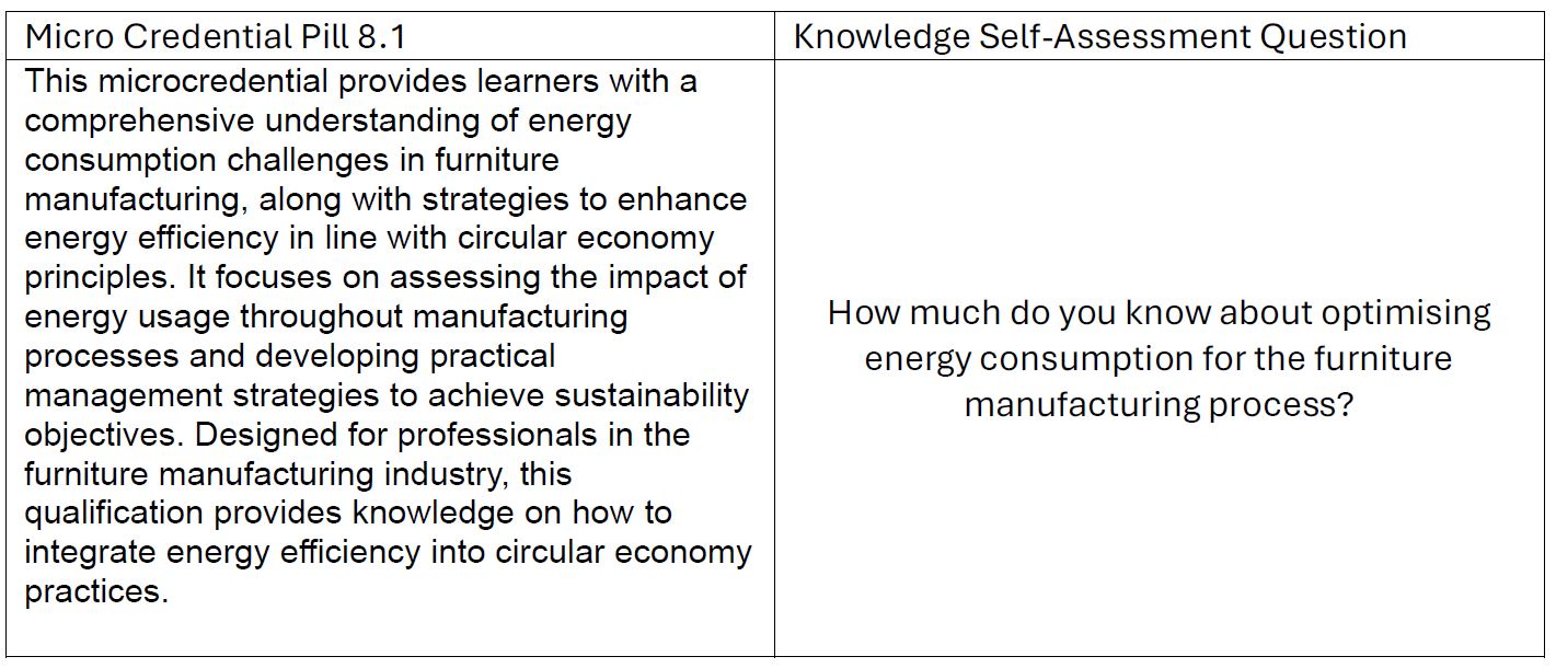 The questions for the self-assessment tool were developed based on the micro-credentials created for each pill. These micro-credentials describe the main takeaways for the learner at each stage of each module and, as such, represent a very concise source to base the questions on. The CirCLER curriculum is designed for both furniture industry practitioners and higher education students, each of whom brings different skills and knowledge with them before undertaking the curriculum. Early on in the development of the self-assessment tool, it was decided that the questions would need to assess both the individual's skills and their knowledge of each pill in the CirCLER Curriculum. As such, two sets of questions were developed that considered the individual's skills or their knowledge of the circular furniture industry.